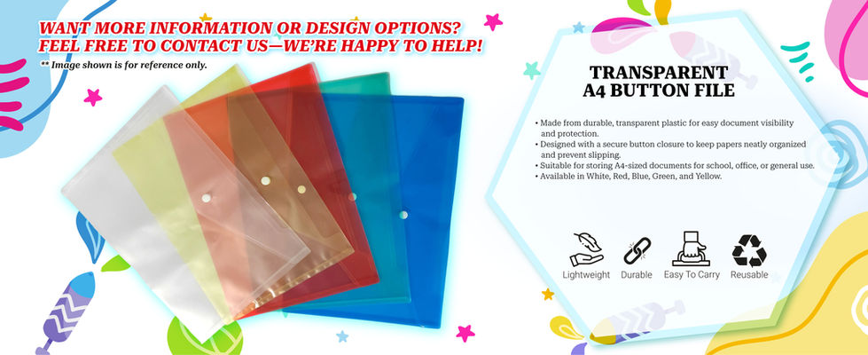 Made from durable, transparent plastic for easy document visibility and protection. Designed with a secure button closure to keep papers neatly organized and prevent slipping. Suitable for storing A4-sized documents for school, office, or general use. Available in White, Red, Blue, Green, and Yellow.